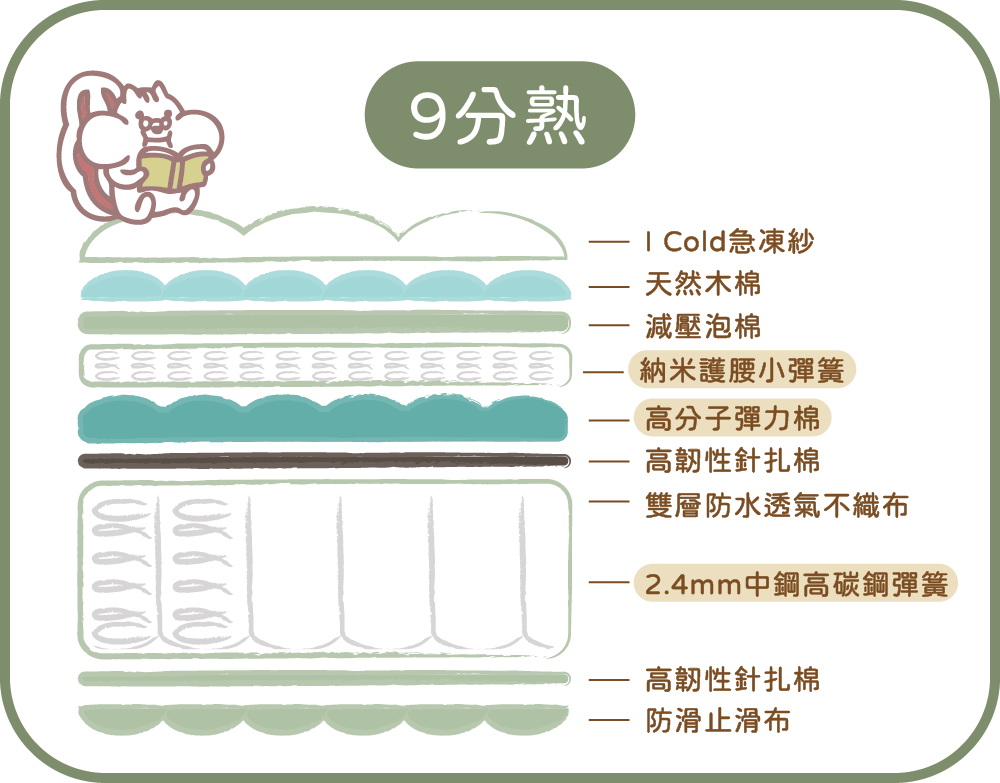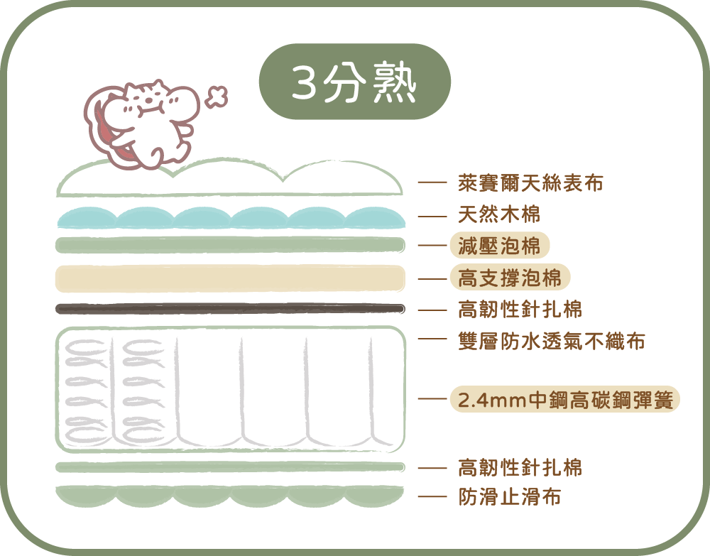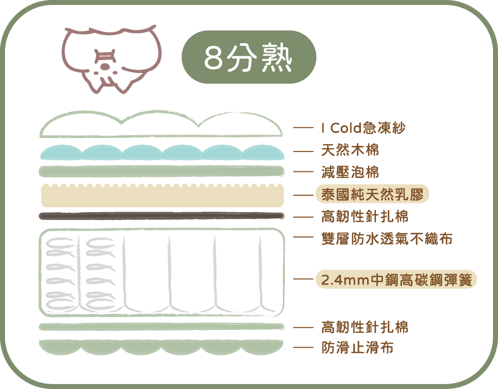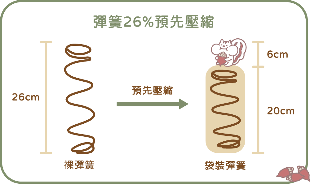 熟晨獨立筒床墊彈簧裸簧高度為26公分,獨立筒彈簧為20公分,代表獨立筒彈簧壓縮了公分,也就是預先壓縮了26%之後,才裝入不織布袋子成為獨立筒彈簧。 預先壓縮能增加彈簧初始的回彈力量,增加對身體支撐性的靈敏度。