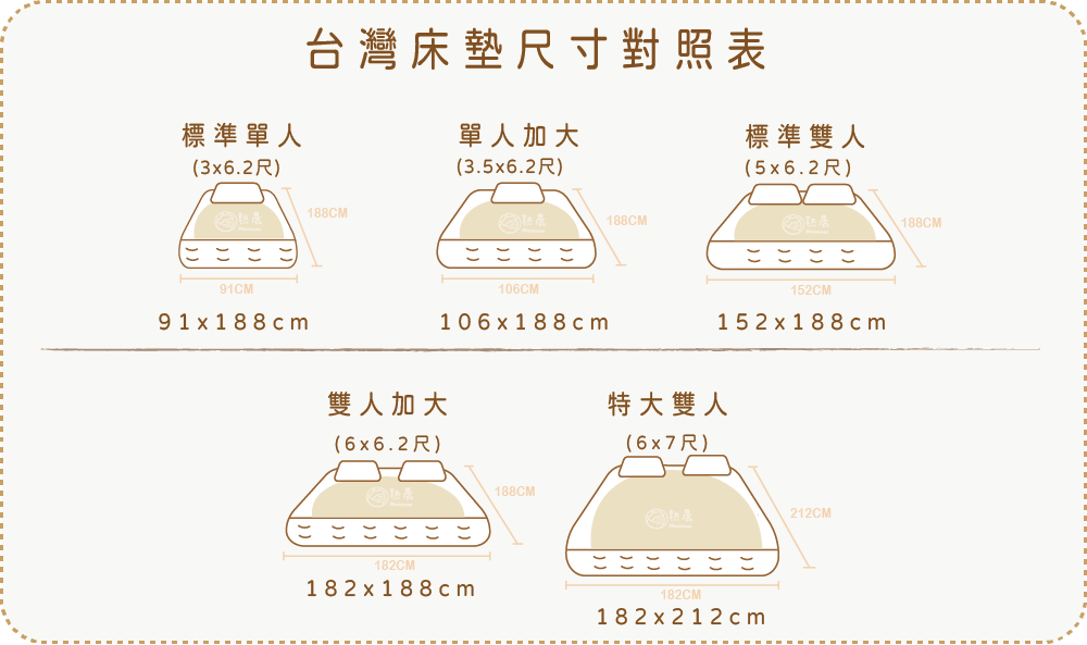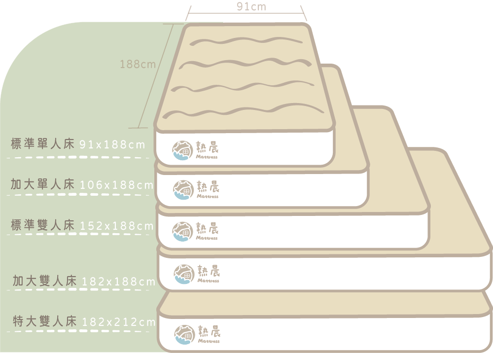 如果有訂製不同國家規格床墊的需求,無論是台灣床墊尺寸、歐規床墊尺寸、日規床墊尺寸、美規床墊 尺寸,或是家中因為裝潢或空間限制需訂製床墊尺寸,熟晨床墊提供任何床墊尺寸客製化服務,若有訂 製床墊需求歡迎LINE 或FB 聯繫唷!
