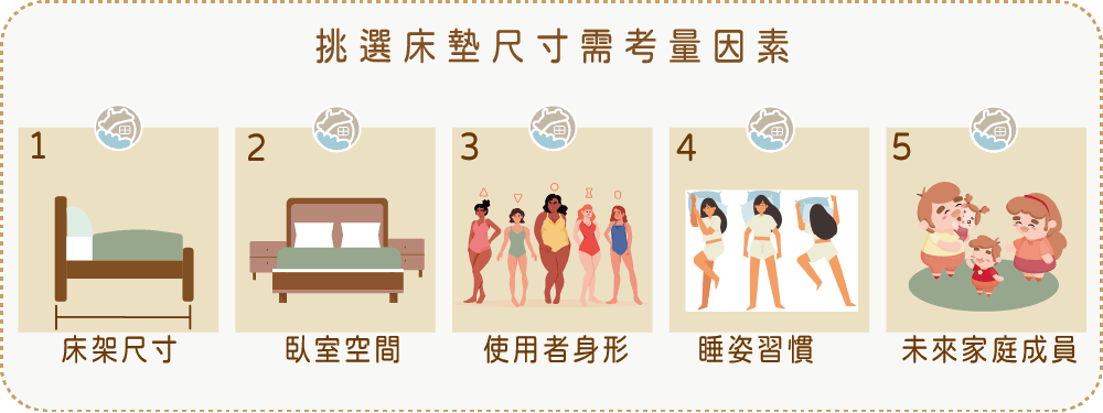 床墊除了要好入睡,也要讓你睡著後好翻身、不容易干擾伴侶,用身高最高、肩膀最寬的人作為標準 來挑選床墊尺寸也是很推薦的方式。 身高:床墊長度建議比最高者的身高多上10公分~20公分, 睡覺時頭頂預留枕頭空間,腳也不會懸空超出床墊(睡覺時腳會自然彎曲)。